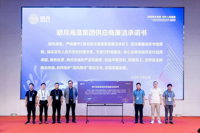 隨后,在集團(tuán)副總裁李振廣詳盡地為大家解讀供應(yīng)商管理和質(zhì)量管理體系的相關(guān)內(nèi)容后,7家戰(zhàn)略供應(yīng)商代表上臺簽訂《青島明月海藻集團(tuán)供應(yīng)商廉潔承諾書》。