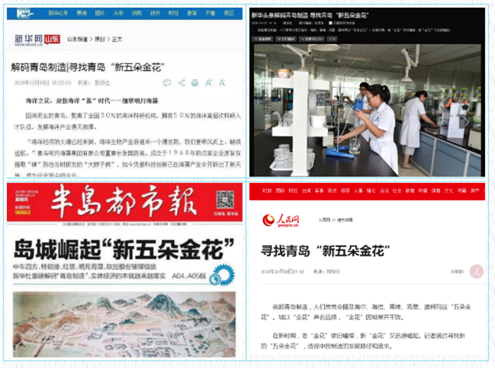 品牌成就城市,城市造就品牌。2016年8月,新華社“解碼青島”專題調(diào)研組抵青,圍繞“青島制造”的主題開展了集中調(diào)研,以“青島制造”為樣本,探尋中國制造之路。調(diào)研組先后到海爾、海信、青啤、雙星、澳柯瑪、明月海藻等22家知名企業(yè)進(jìn)行實(shí)地調(diào)研采訪。新華社在調(diào)研之后,陸續(xù)推出了一系列“尋找青島‘新五朵金花’”的報(bào)道,其中,青島明月海藻集團(tuán)因其鮮明的海洋品牌特色,被譽(yù)為青島“新五朵金花”之“海洋之花”。