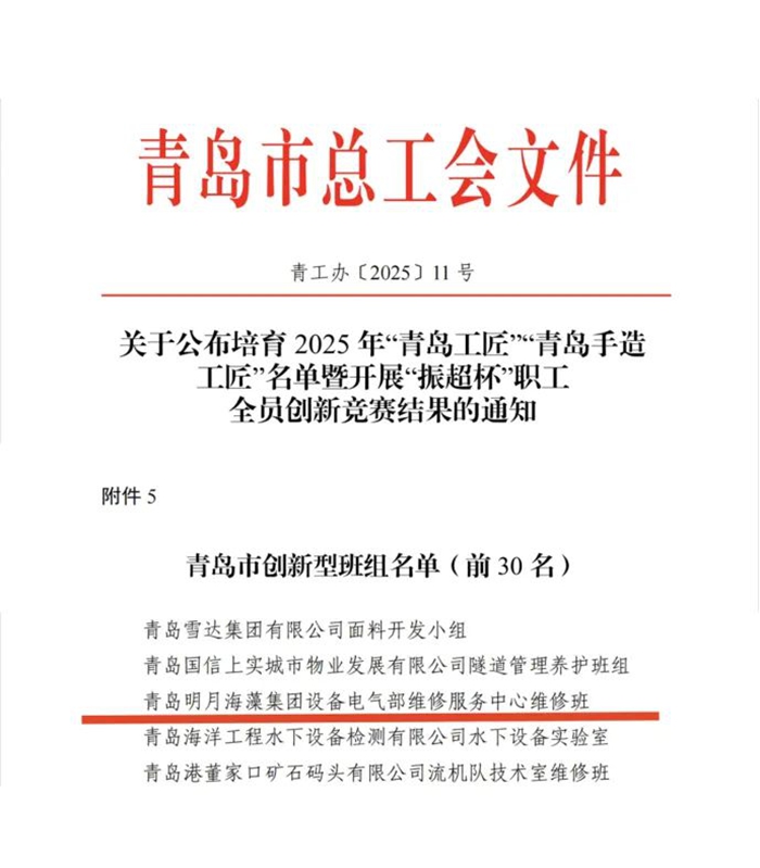日前,青島市總工會(huì)發(fā)布《關(guān)于公布培育2025年“青島工匠”“青島手造工匠”名單暨“振超杯”職工全員創(chuàng)新競(jìng)賽結(jié)果的通知》。在評(píng)選出的30個(gè)“青島市創(chuàng)新型班組”中,明月海藻集團(tuán)設(shè)備電氣部維修服務(wù)中心維修班憑借卓越的創(chuàng)新實(shí)踐能力成功入選,榮膺該稱(chēng)號(hào)!