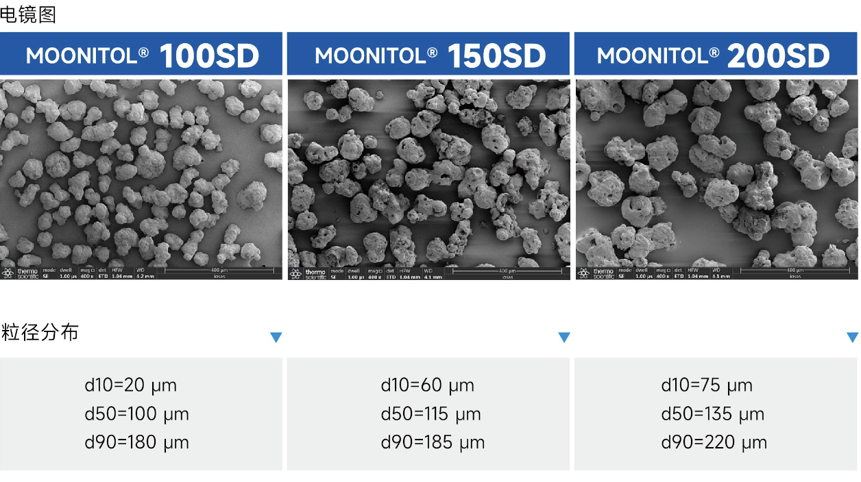 通過噴霧干燥制得的顆粒狀甘露醇SD系列,作為藥用輔料填充劑,具有良好的流動(dòng)性、可壓性、混合性,特別適應(yīng)于直壓片工藝和直接混料工藝。